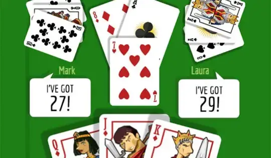 Your goal is to get the highest scoring hand you can, either by getting cards of the same rank or same suit. The value of your hand is calculated by adding up the total of your cards in any one suit. Regular cards are worth their number, face cards are worth 10 and Aces are worth 11, but they only score if they are in the same suit. You can also make a hand of three cards with the same rank, like 8-8-8 or J-J-J. This is worth 30.5 points, unless you have 3 Aces, which is worth 32 points.