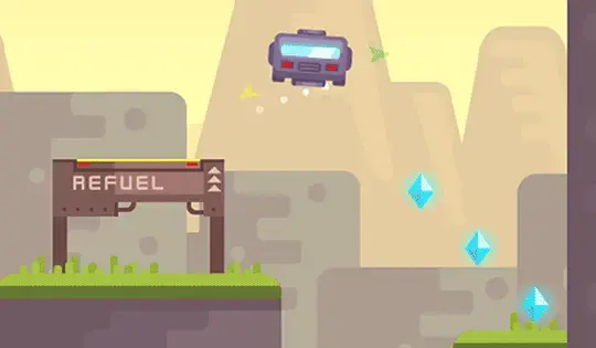Use the on-screen buttons to fly your space ship. The yellow arrow points to the refueling station, and the green arrow points to the finishing platform. Land slowly to avoid damaging your ship.