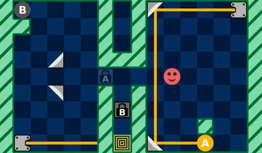 Push the laser-emitting blocks into position so that the lasers hit the circles with letters in them. Once a laser hits a circle, a gate with the same letter will unlock. Find the correct order and positioning to escape!