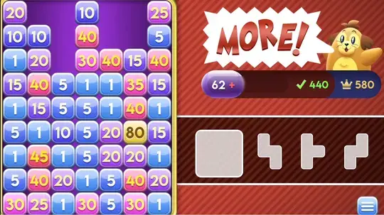 Click and drag the blocks onto the More or Less grid. On the first turn, you'll add all the numbers inside the block. On the next turn, you subtract from your total score. Try not to subtract a big number!