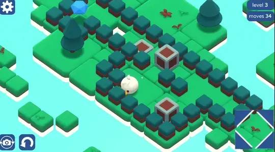 Use the Arrow Keys, WASD, or click the on-screen arrows to move. Your goal is to push the boxes into the water to build a path to the jewel!