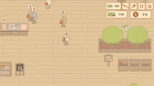 You need to stock each item for your customers to buy. You can go to where your item grows (either carrots or apples) and stand there for a second to harvest each item. Once you have enough, you can take it to their shelves for customers to pick up. If you have too much stock in your hands and can't place something on a shelf, head to the trash bin near the register to get rid of it.