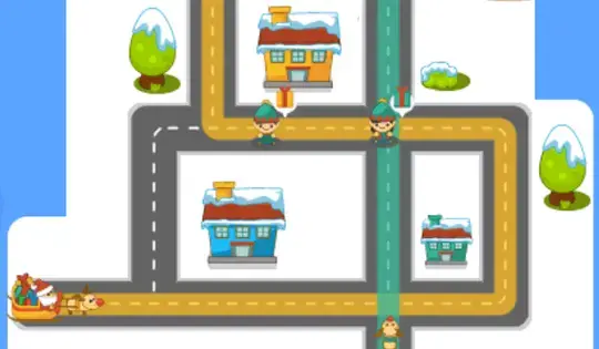 Draw a path for Santa through the town. Pick up each gift from an elf and drop it off at a house of the matching color. If you have multiple sleighs, keep them out of each other's way!