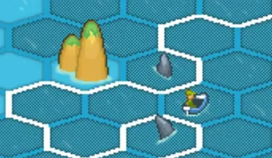 Tap on a tile to move your boat. The dark squares show where the sharks can move. Stay in the light squares and reach the buoy safely.