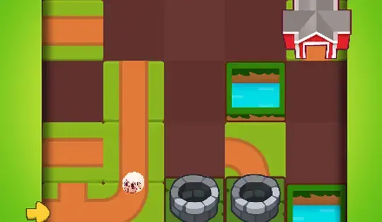 Drag a tile to connect it to the path. The goal of Sheepdom is to create a path from the starting space to the barn, so the sheep can get there safely. If a sheep reaches the end of your path before you've reached the barn, it will disappear. Finish your path before you run out of sheep!