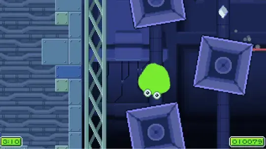 Your goal is to reach the end of the level before time runs out! Collect floppy disks to earn more points for your score. You can also collect slime to grow bigger. If you press the DOWN arrow or S key, you'll go back to a normal size.