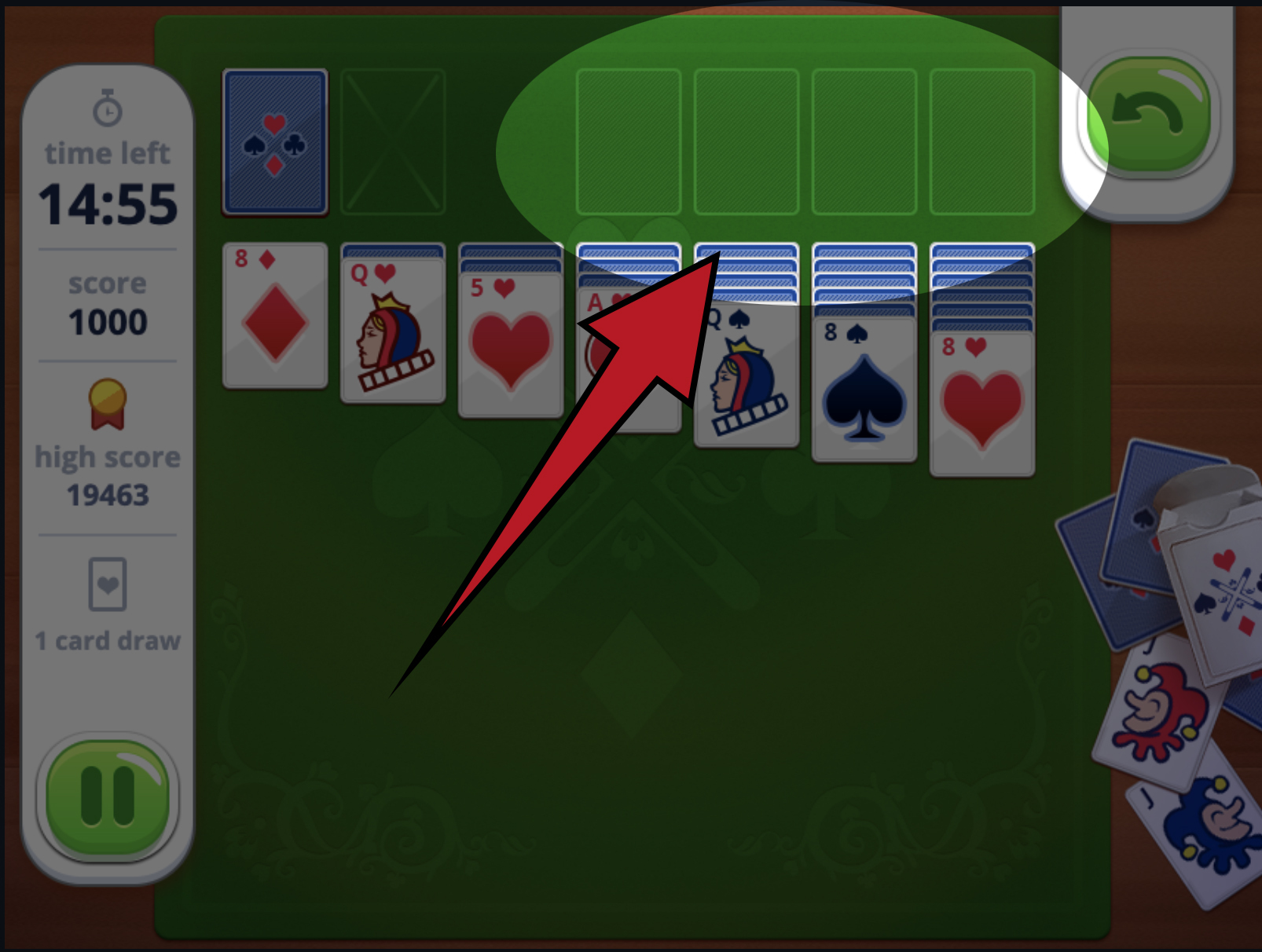 Patience is key. The biggest asset you have in a game of solitaire is patience. The game makes you think carefully and make educated guesses when plotting your moves. Moving around cards without a thought may back you into a corner and force you to restart the hand. Study each card carefully before moving and remember: it’ll cost you points to undo moves!