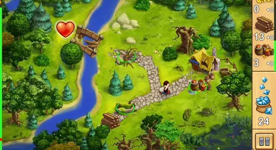 单击资源或障碍物以将工作人员发送给它。收集钻石并使用它们购买升级和特殊能力。收集心脏以击败关卡并重建您的王国!
